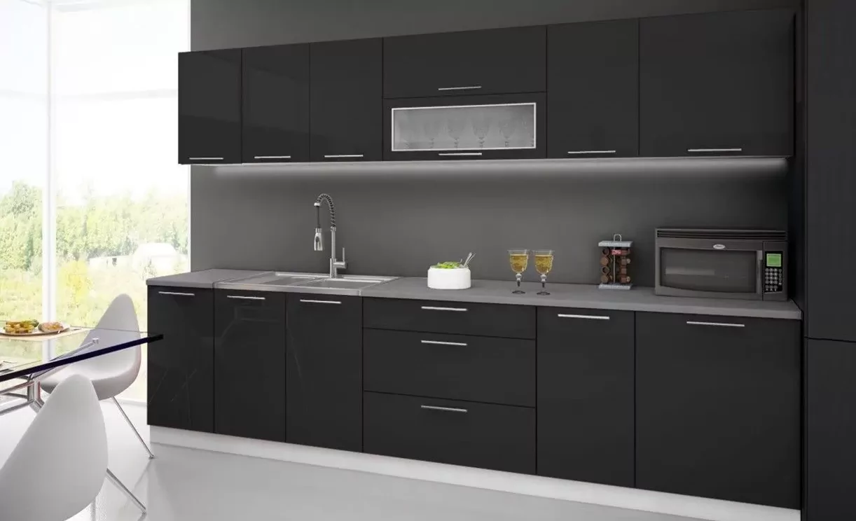 Cuisine complète 300cm noir laqué avec plan de travail 28mm