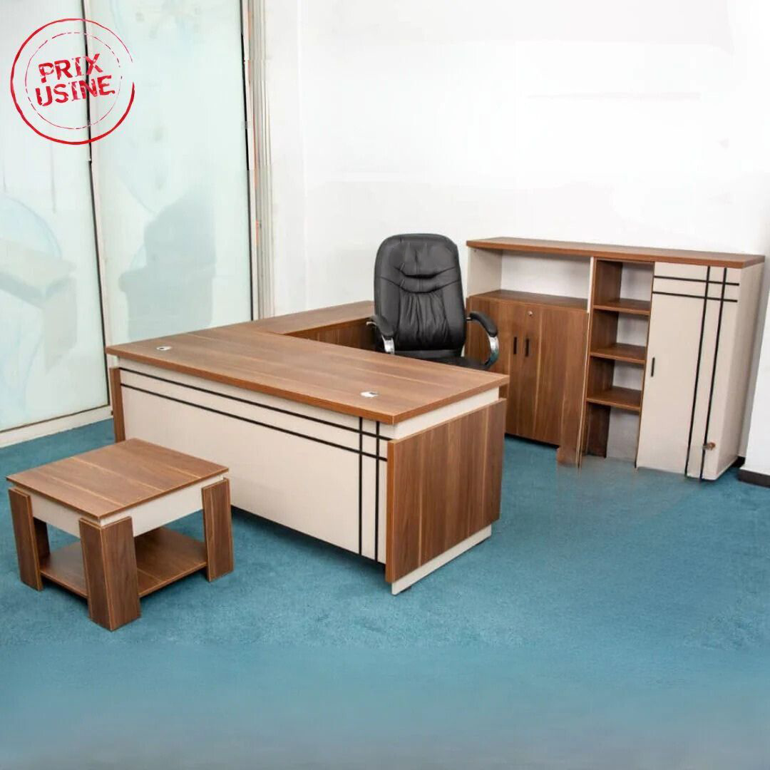 - Bureau en bois avec Retour et Caisson mobile composé de : 1 plan principal constitué d’un plateau et deux pieds d’épaisseur 19 mm . Profondeur 800 mm hauteur 740 mm 1 voile d’épaisseur 19 mm Les piètement de bureau sont réalisé en panneaux de particules épaisseur 38 mm Tous les chants visibles sont bordés d’un PVC de 0,8 mm d’épaisseur 1 caisson roulant à 3 tiroirs en Bois Finition en mélaminé.